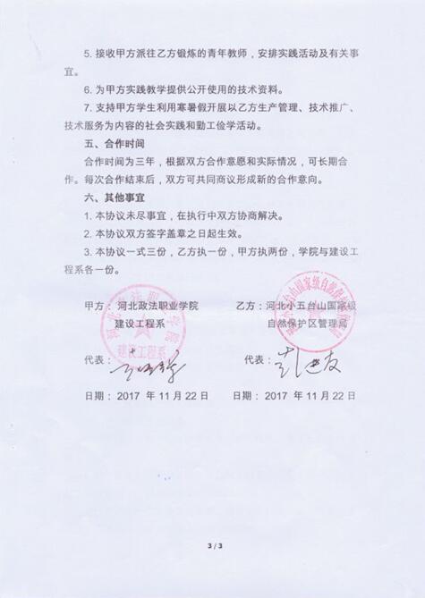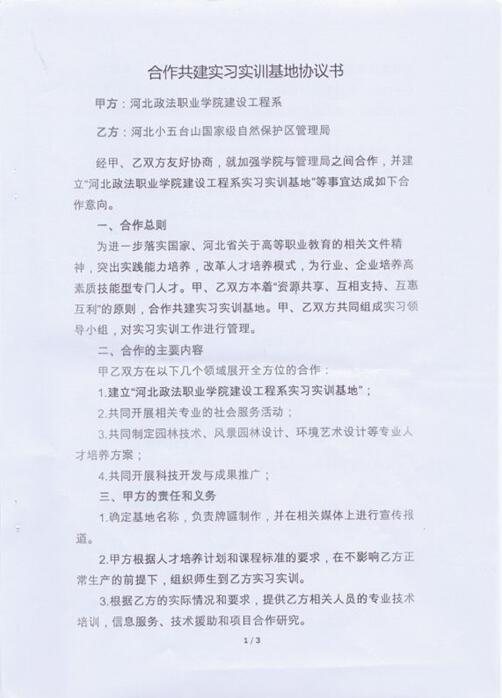 2017年11月22—24日,由院紀(jì)委書記李春興同志帶隊(duì),建設(shè)工程系趙亞輝主任、園林教研室馬英副教授一行赴張家口市蔚縣“河北小五臺(tái)國家級(jí)自然保護(hù)區(qū)管理局”進(jìn)行了實(shí)地考察。在金河口管理區(qū)會(huì)議室,由學(xué)院紀(jì)委書記李春興同志主持,經(jīng)過雙方友好協(xié)商與溝通,簽訂了學(xué)院與林業(yè)行業(yè)《合作共建實(shí)習(xí)實(shí)訓(xùn)基地協(xié)議》。參加簽字儀式的有:河北小五臺(tái)國家級(jí)自然保護(hù)區(qū)管理局局長兼書記彭進(jìn)友同志、辦公室主任郝敏、主任楊照、金河口管理區(qū)主任李小東;學(xué)院建設(shè)工程系主任趙亞輝、園林教研室馬英副教授。