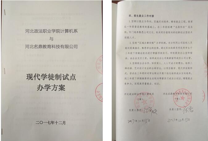 為貫徹落實黨的十九大“產(chǎn)教融合、校企合作”的職教方針,進一步提高學院人才培養(yǎng)質(zhì)量,計算機系針對數(shù)字媒體應(yīng)用技術(shù)(三維動畫設(shè)計方向)和藝術(shù)設(shè)計(視覺傳達方向)兩個專業(yè),與河北銘鼎教育科技有限公司在“定向培養(yǎng)、精準就業(yè)”框架協(xié)議的基礎(chǔ)上,合作編制“現(xiàn)代學徒制”試點工作辦學方案,明確責任與義務(wù),在我院設(shè)公司駐校辦事處,實現(xiàn)中高層管理對接、人才培養(yǎng)工作對接、創(chuàng)新創(chuàng)業(yè)對接和招生就業(yè)對接。