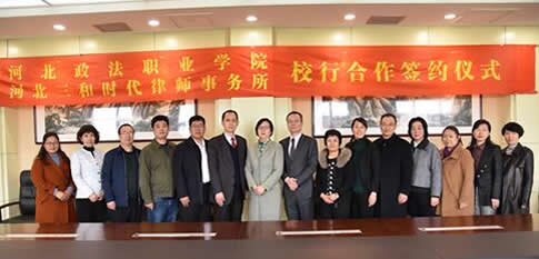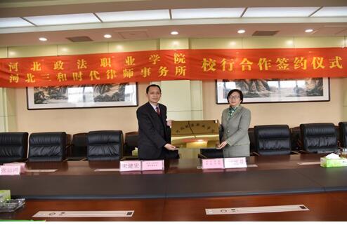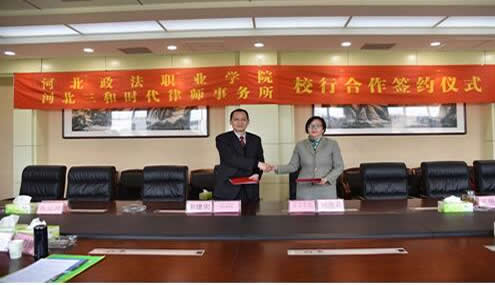 在熱烈友好的氣氛中,學(xué)院副院長劉蓮花和河北三和時代律師事務(wù)所宋建宏主任簽訂校行合作協(xié)議;共同為雙方授牌,互授“實(shí)踐教學(xué)基地”和“人才培養(yǎng)基地”牌匾。