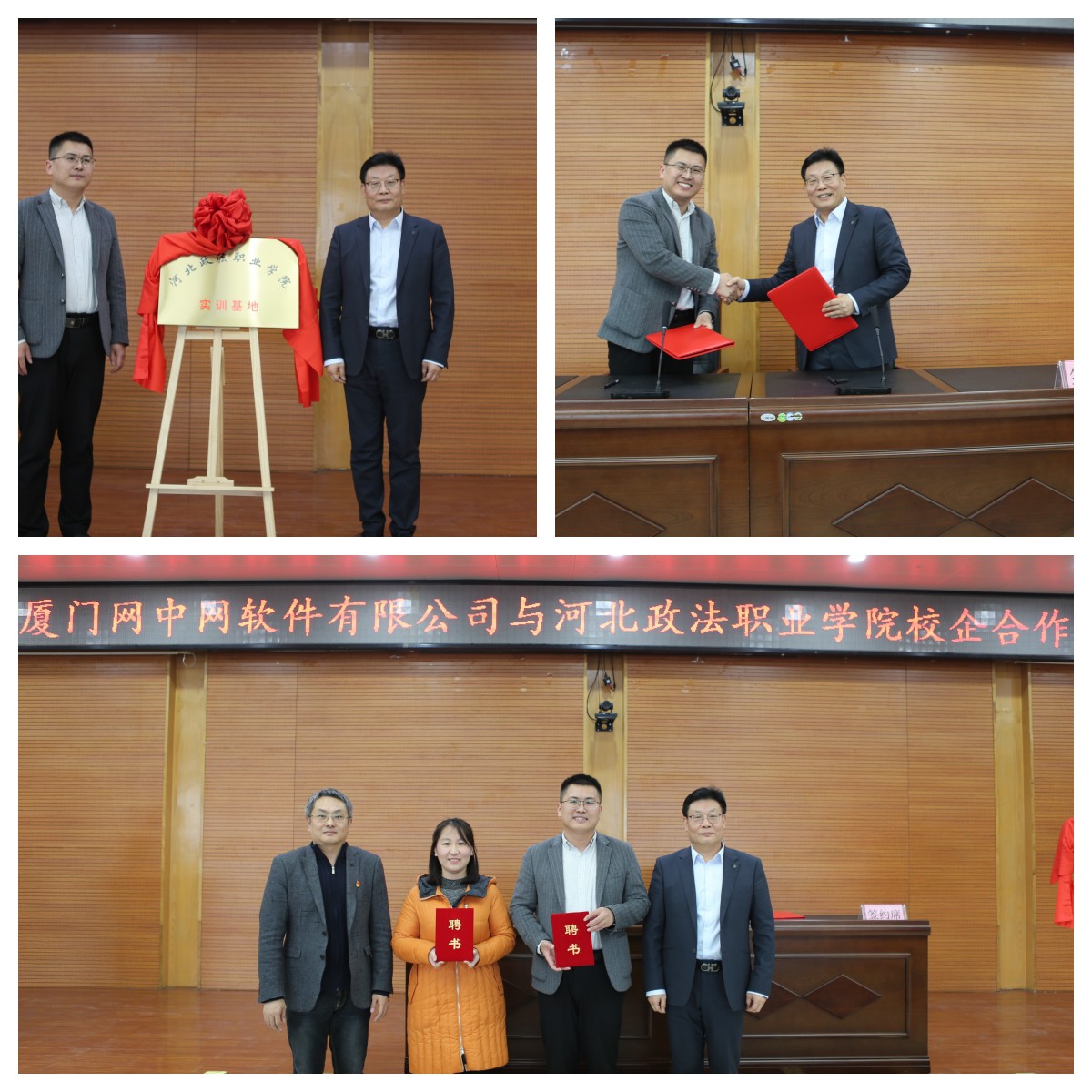 馮兆蕙副院長與季金總經理分別代表校企雙方簽訂了《校企合作協議》,并共同為“河北政法職業學院實訓基地”進行揭牌;馮兆蕙副院長與武輝處長分別為季金和單琳頒發企業導師聘書。