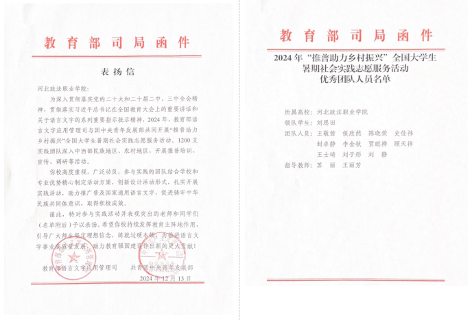 近日,由教育部語言文字應(yīng)用管理司、共青團(tuán)中央青年發(fā)展部聯(lián)合主辦的2024年“推普助力鄉(xiāng)村振興”全國大學(xué)生暑期社會(huì)實(shí)踐志愿服務(wù)活動(dòng)評優(yōu)結(jié)果正式揭曉,我校行政法務(wù)系“未來普法宣傳隊(duì)”憑借卓越表現(xiàn)脫穎而出,榮獲“優(yōu)秀團(tuán)隊(duì)”稱號,贏得了教育部語言文字應(yīng)用司和共青團(tuán)中央青年發(fā)展部的高度贊揚(yáng),為學(xué)校的社會(huì)實(shí)踐志愿服務(wù)成果再添輝煌一筆。此次活動(dòng)共有來自全國的1200支實(shí)踐團(tuán)隊(duì)深入中西部民族地區(qū)、農(nóng)村地區(qū)積極開展各類志愿服務(wù)活動(dòng),在助力鄉(xiāng)村振興的道路上貢獻(xiàn)著青春力量。