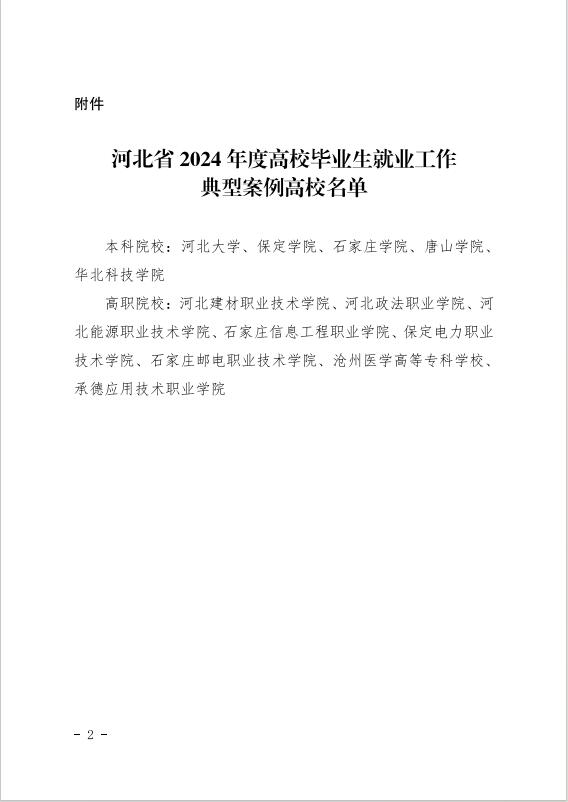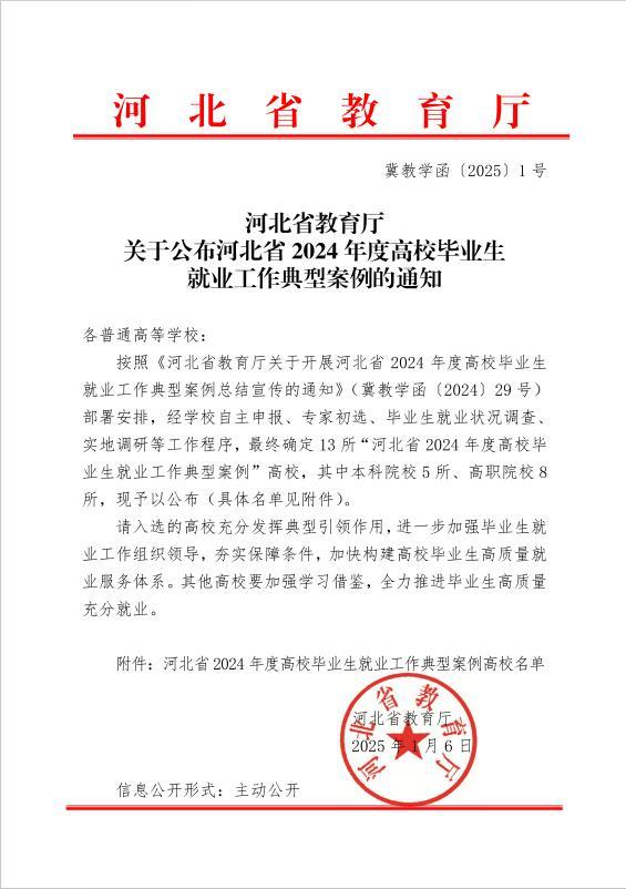 1月6日,河北省教育廳印發《關于公布河北省2024年度高校畢業生就業工作典型案例的通知》(冀教學函〔2025〕1號),我校入選“河北省2024年度高校畢業生就業工作典型案例”。